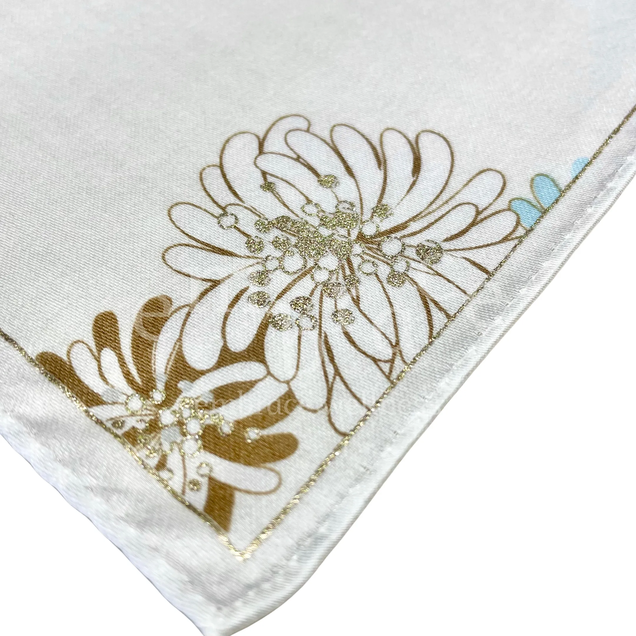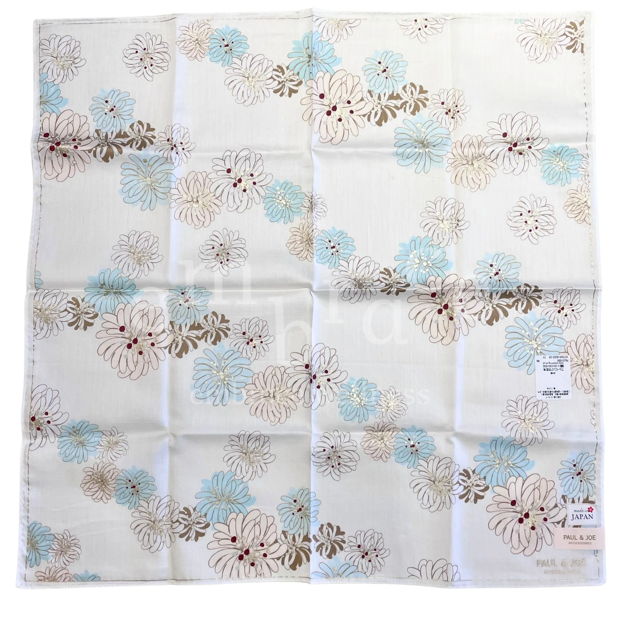 A touch of Parisian charm meets Japanese craftsmanship. This Paul & Joe Accessoires cotton handkerchief features a signature chrysanthemum print in soft white, powder blue, and gold — finished with a delicate metallic thread border. Made in Japan from 100% premium cotton. 19″ × 19″.