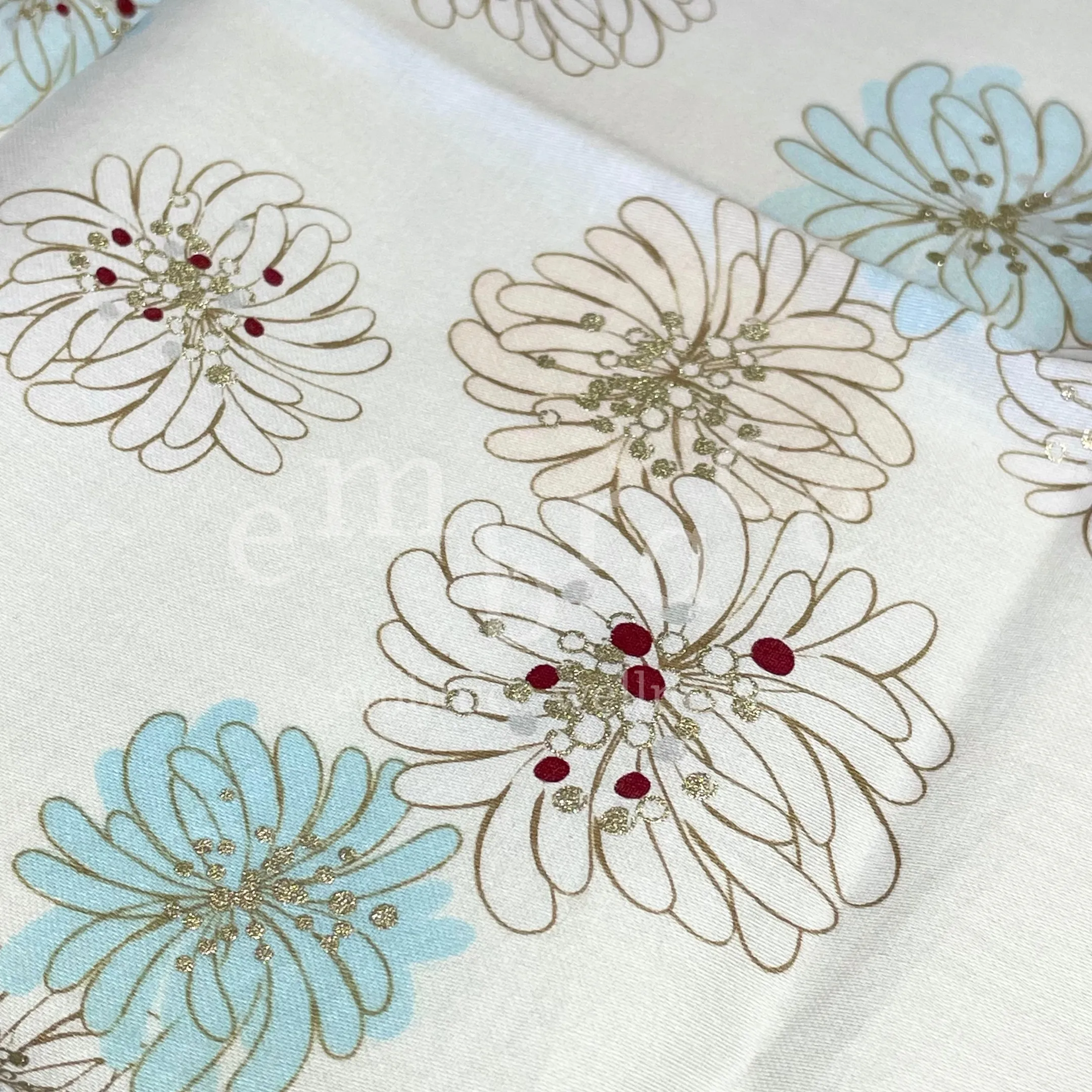 Delicate chrysanthemum blooms cascade across the white cotton ground in a flowing diagonal arrangement — rendered in soft powder blue, warm ivory, rich taupe, and punctuated with deep crimson accents. Each bloom features a gold metallic glitter centre, catching the light with every movement. A fine gold thread border frames the entire piece, adding a polished finishing detail.